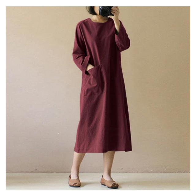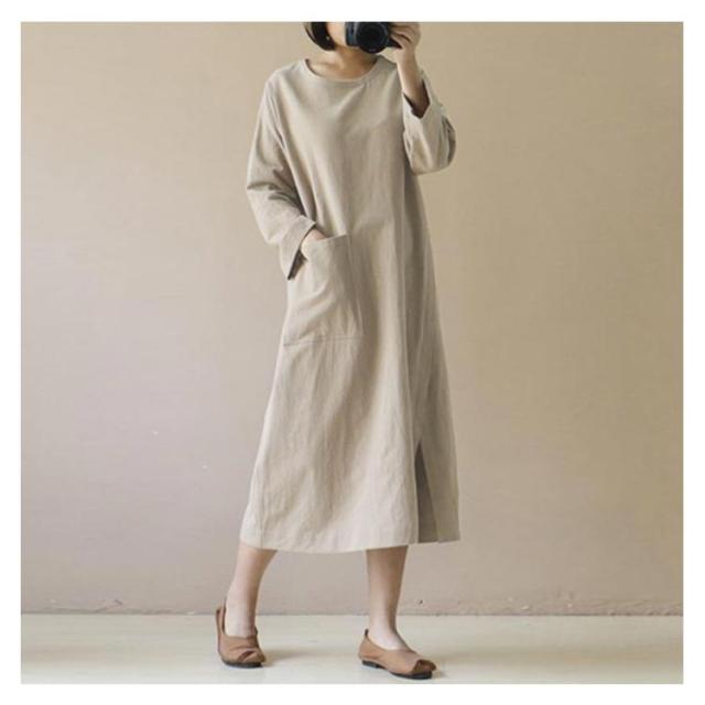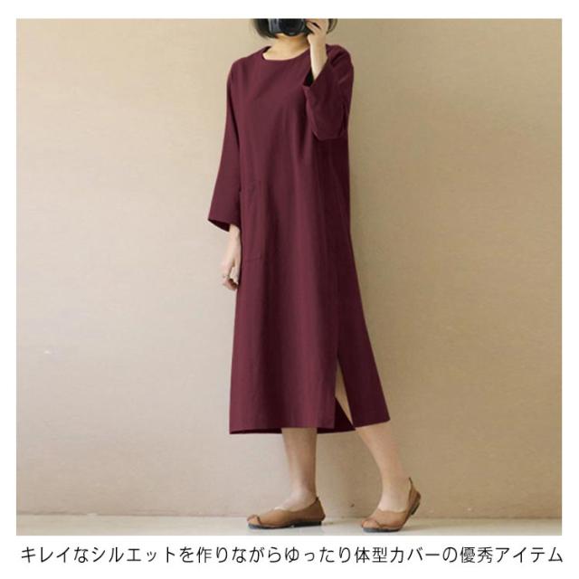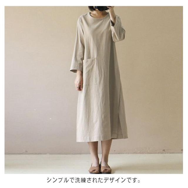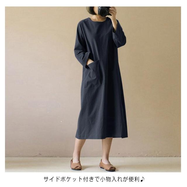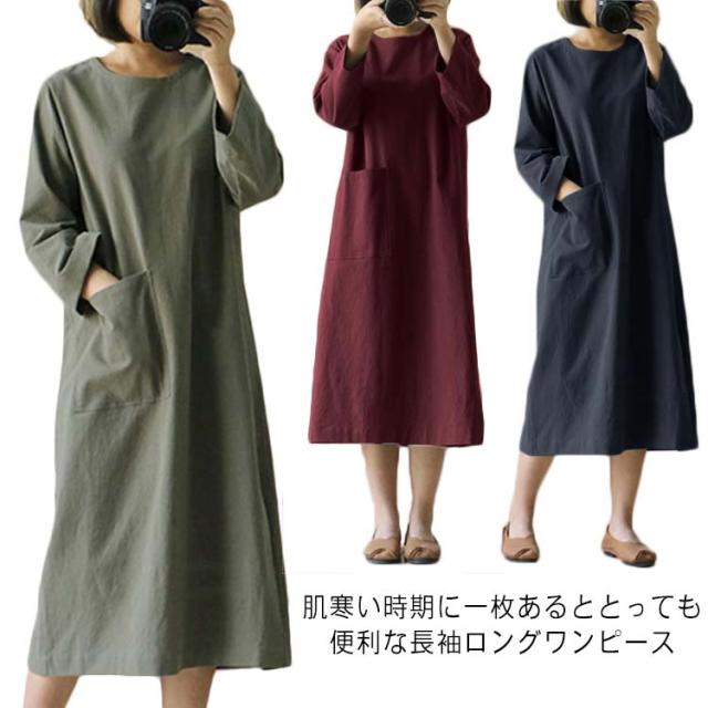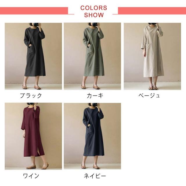 ワンピース 秋 長袖 無地 シンプル ポケット付き ベージュ ワイン カーキ ブラック ネイビー