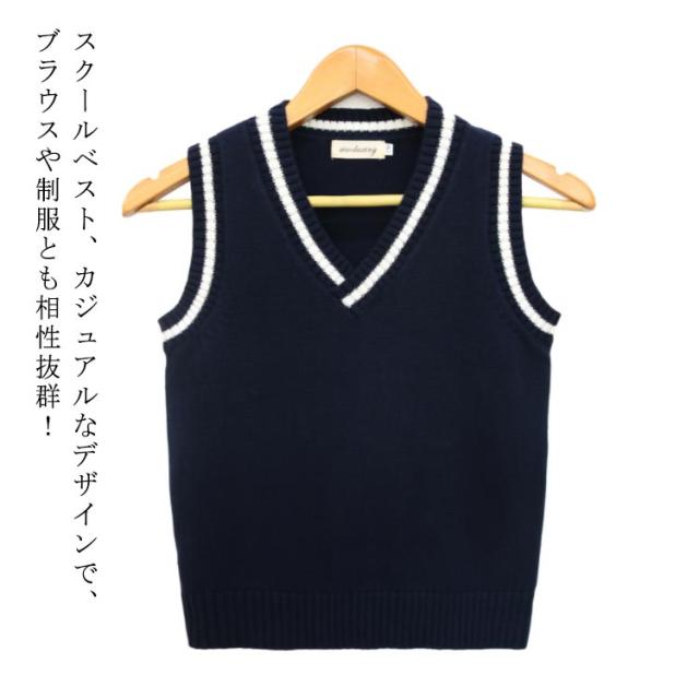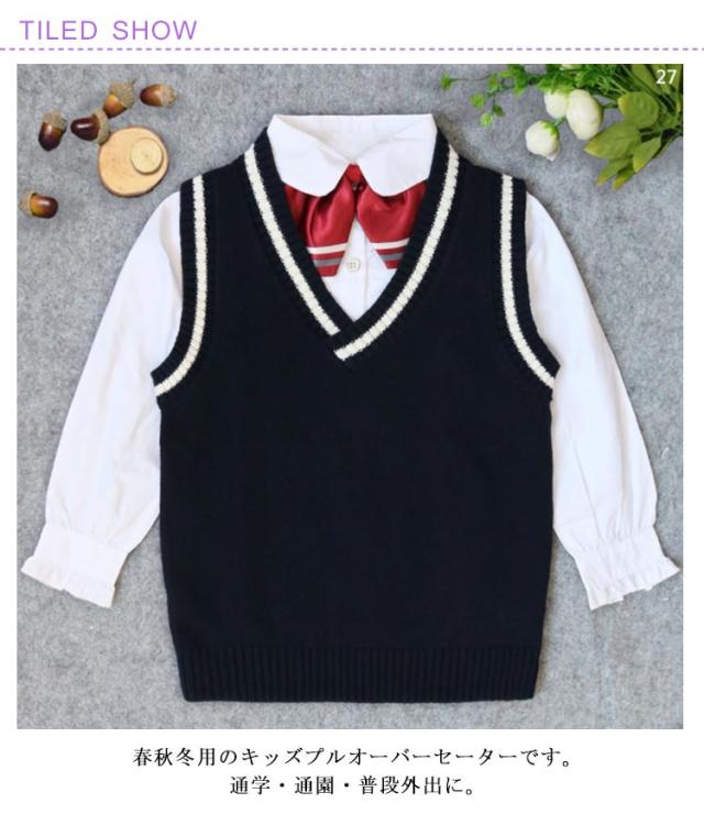 | スクールベスト、カジュアルなデザインで、ブラウスや制服とも相性抜群! 春秋冬用のキッズプルオーバーセーターです。通学・通園・普段外出に。 首元を綺麗に見せるVゾーンと、程よくゆとりを持たせたシルエットが清楚さを演出!しわになり難く、型崩れしにくい、お手入れがしやすいニットです。 肌触りのいい綿素材で、通年着心地よくご利用いただけます。家庭洗いも可能なので、お手入れが非常に簡単です。 | |