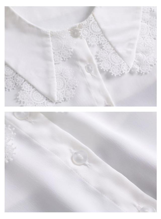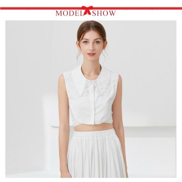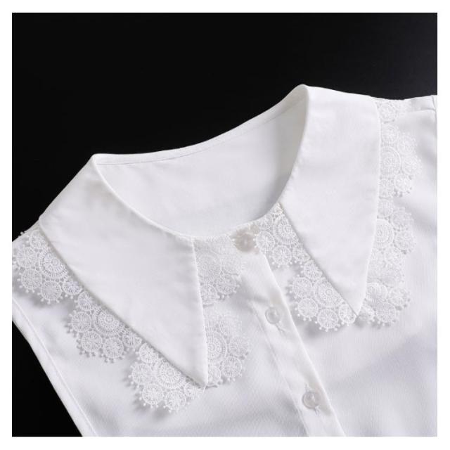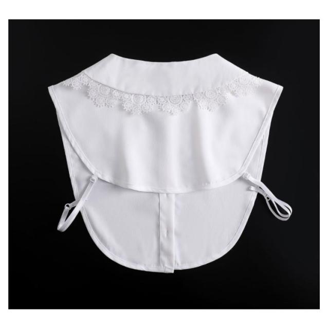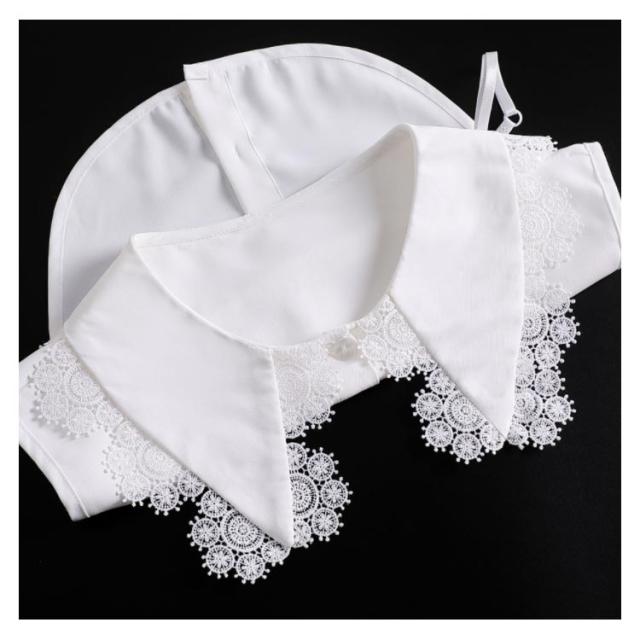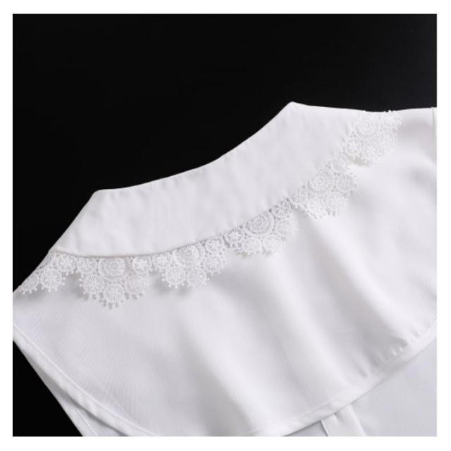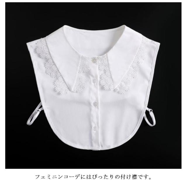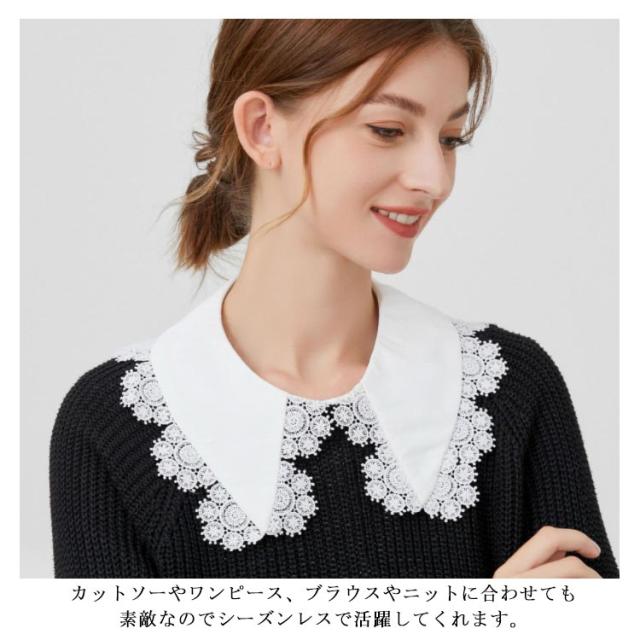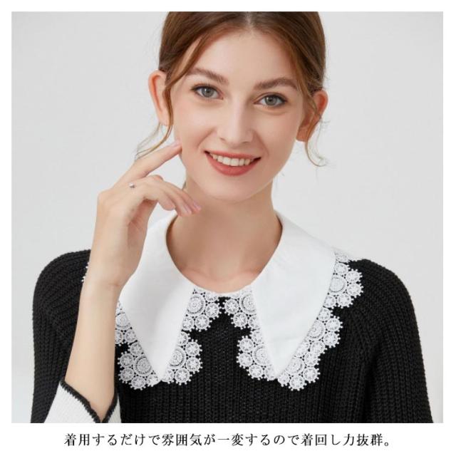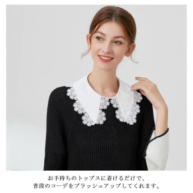 | 花レースが愛らしい表情を見せます。 お手持ちのトップスに着けるだけで、普段のコーデをブラッシュアップしてくれます。 着用するだけで雰囲気が一変するので着回し力抜群。 カットソーやワンピース、ブラウスやニットに合わせても素敵なのでシーズンレスで活躍してくれます。 フェミニンコーデにはぴったりの付け襟です。 | |