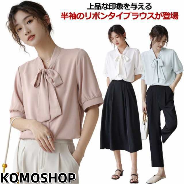 ボウタイ ブラウス 半袖 シャツ オフィス ボウタイ付きブラウス レディース シフォンブラウス リボン 女性 パフスリーブ とろみ 華やか プルオーバー トップス シンプル 通勤 通学 ビジネス カジュアル 上品 きれいめ フォーマル 入学式 卒業式 入園式 卒園式 送料無料