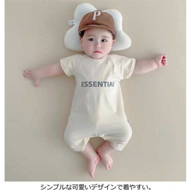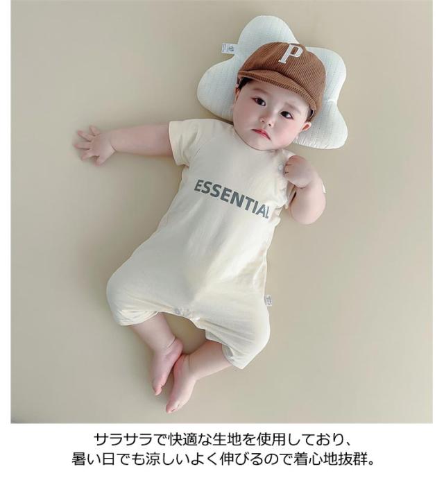 | 正面におしゃれ「ESSENTIAL」のロゴ付き赤ちゃんロンパース 半袖タイプで涼しいサマーロンパース シンプルな可愛いデザインで着やすい サラサラで快適な生地を使用しており、暑い日でも涼しい よく伸びるので着心地抜群 | |