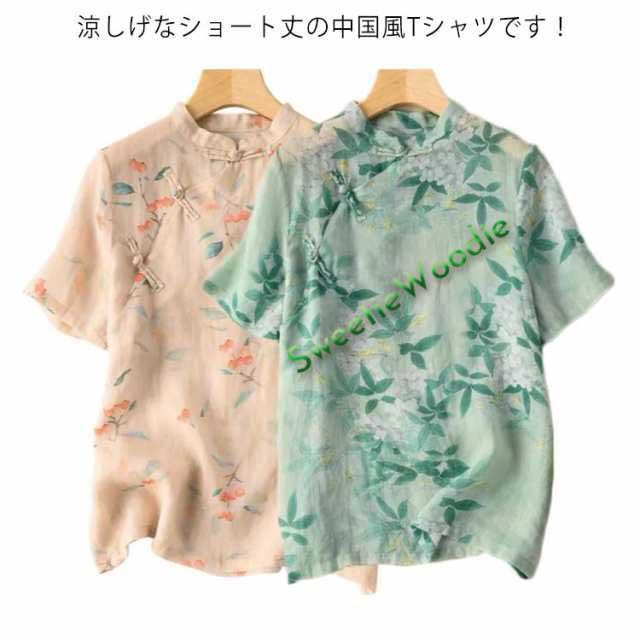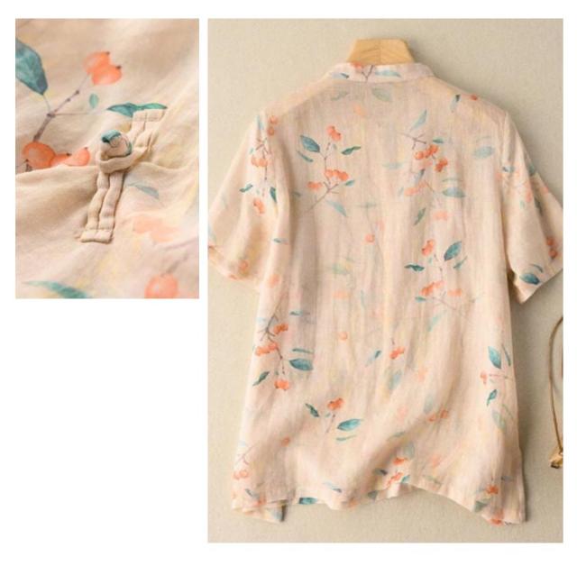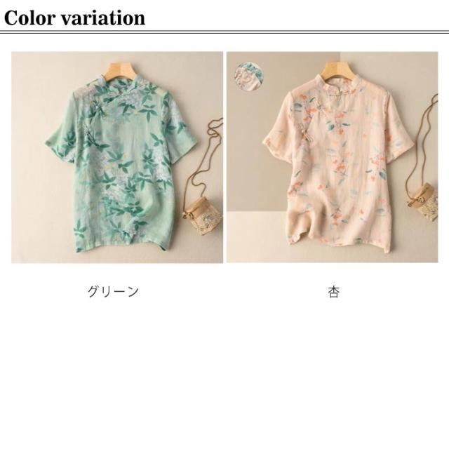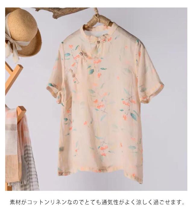 綿麻 ブラウス 花柄 立ち襟 チャイナ風 トップス チャイナボタン 斜めボタン 半袖 総柄 エスニック トップス ゆったり 着痩せ 綿麻 カジュアル レトロ 夏新作 送料無料