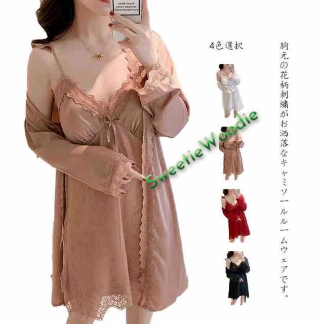 ガウン&キャミワンピ ルームウェア レース シルク風 セクシー パジャマ レディース ワンピース 長袖 ネグリジェ セットアップ ナイトウェア サテン キャミソール セット 送料無料