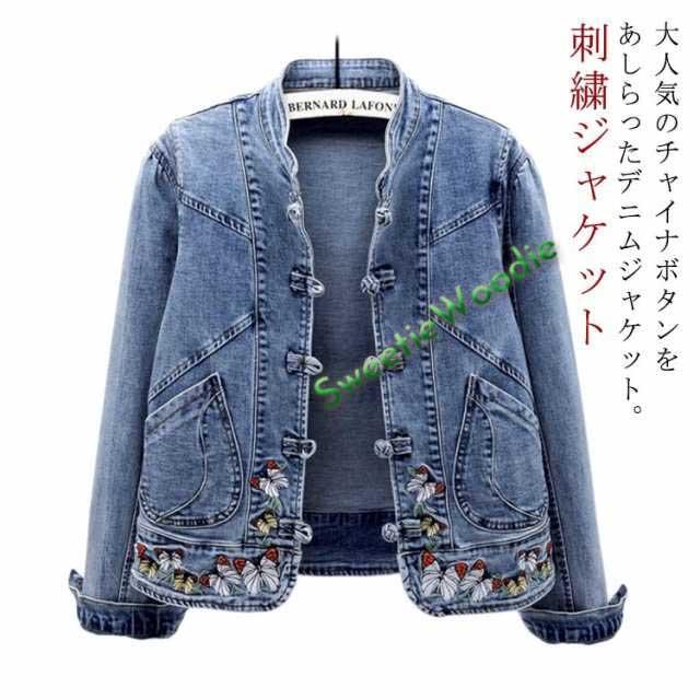送料無料 デニムジャケット 刺繍 春新作 レディースアウター エスニック系 チャイナボタン 長袖 Gジャン 立ち襟 ジャケット ブルゾン 刺繍ジャケット 春 秋 30代 40代 50代