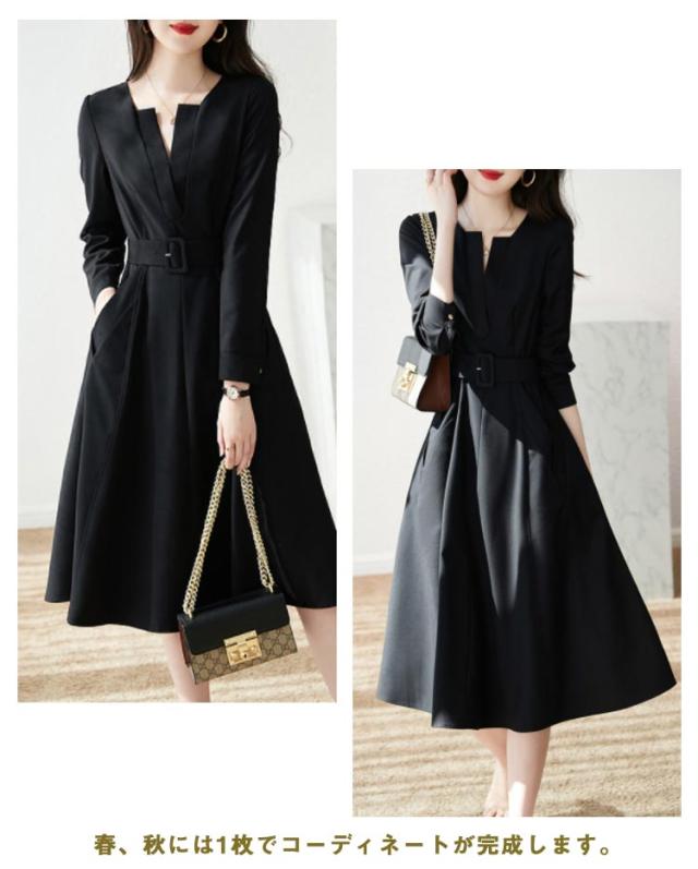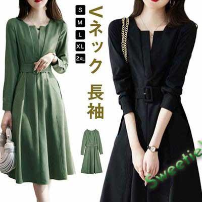 Vネック ワンピース ロングワンピース フォーマルワンピース 膝丈 ミモレ丈 長袖 ひざ丈 パーティードレス 春 秋 大人 上品 エレガント 七五三 卒園式 入園式 パーティー 体型カバー 30代 40代 50代 S M L XL 2XL