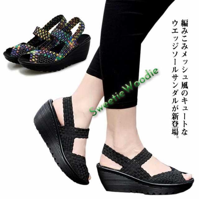 厚底サンダル レディース ウエッジソール サンダル ベルトサンダル ストレッチ オープントゥ ストラップサンダルバックストラップ バックベルトサンダル 編みこみ メッシュ ゴム フィット ラメ オフィスサンダル