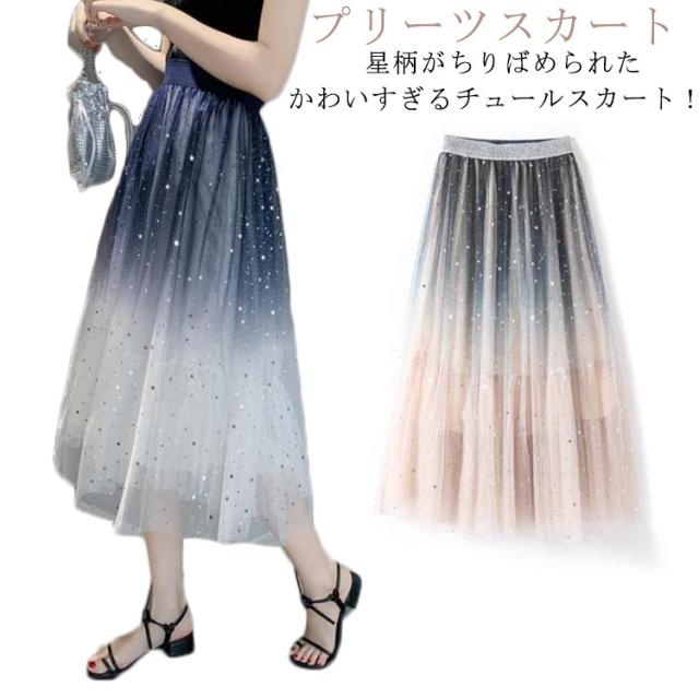 送料無料 星空 プリーツスカート 配色 スカート バイカラー チュールスカート レディース フレア チュールスカート ボトムス ミモレ丈 グラデーション チュールスカート 大人 スカート 星柄 体型カバー フレア 裏地あり ウエストゴム Aライン