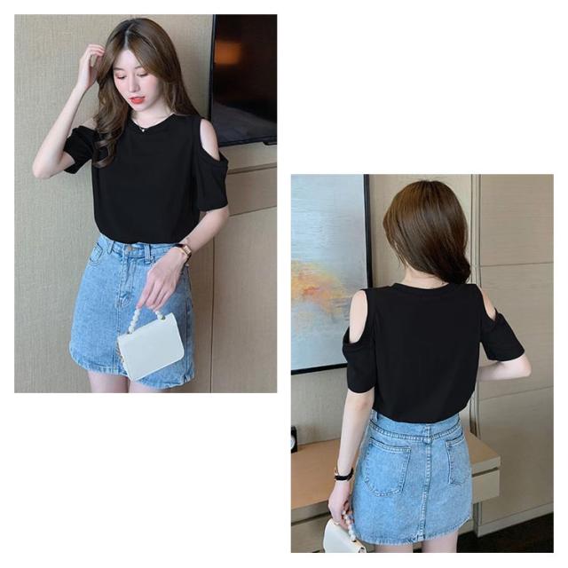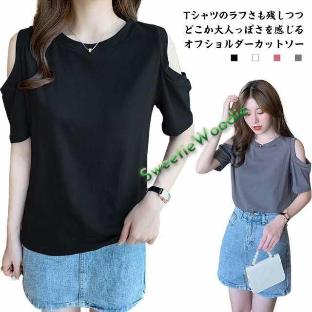 送料無料 オフショルダー カットソー Tシャツ レディース 半袖 オフショル 半袖Tシャツ トップス 肩出し 肩あき 肌見せ クルーネック 夏 無地 ゆったり ビッグTシャツ ブラック ホワイト グレー ピンク