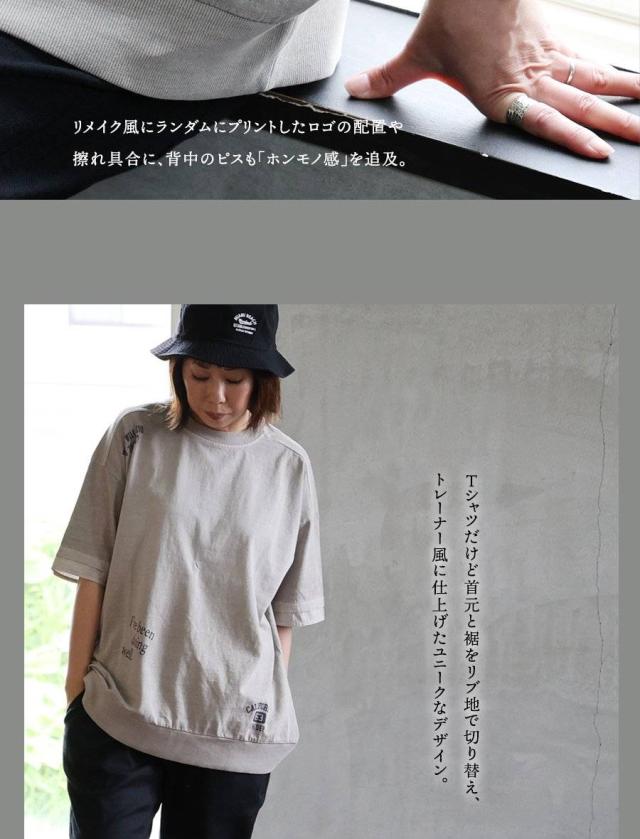 ・Tシャツだけど首元と裾をリブ地で切り替え、トレーナー風に仕上げたユニークなデザイン。