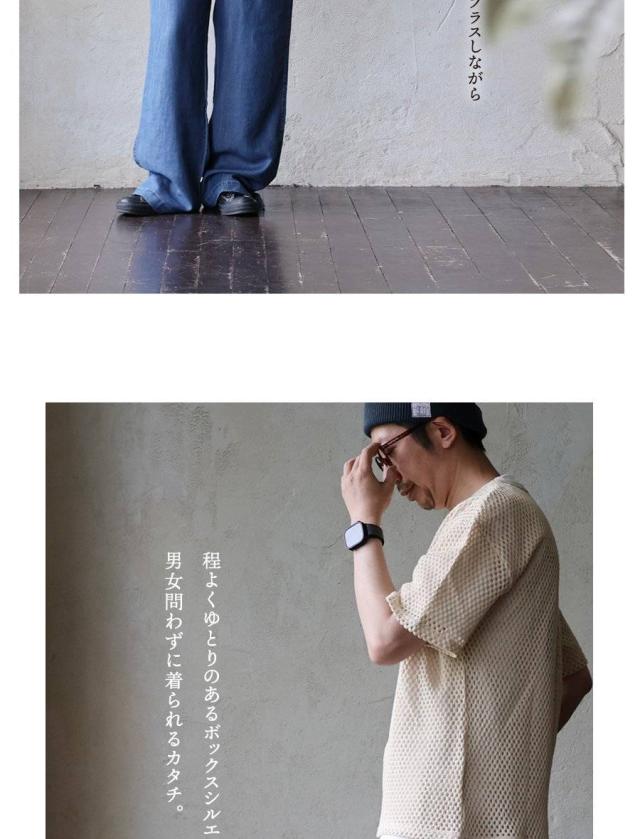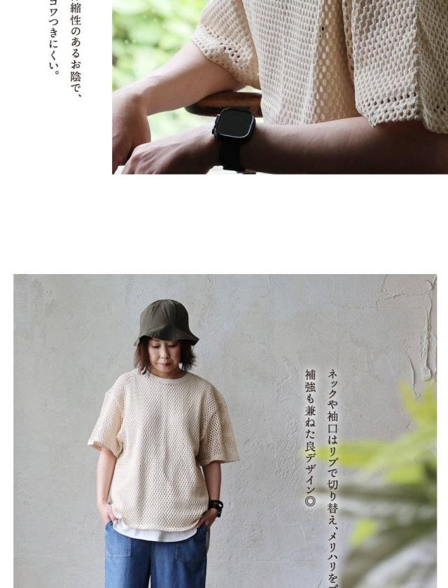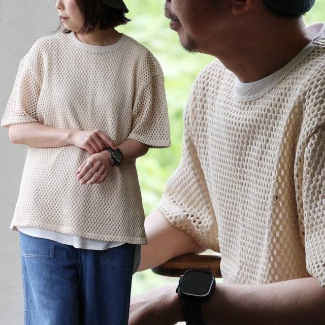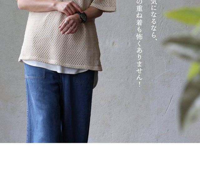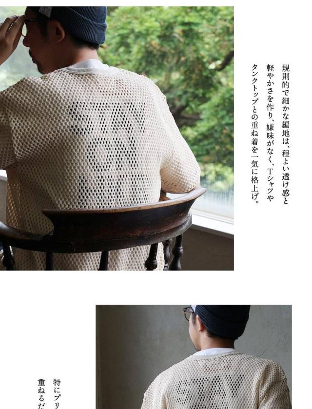 ・規則的で細かな編地は、程よい透け感と軽やかさを作り、嫌味がなく、Tシャツやタンクトップとの重ね着を一気に格上げ。