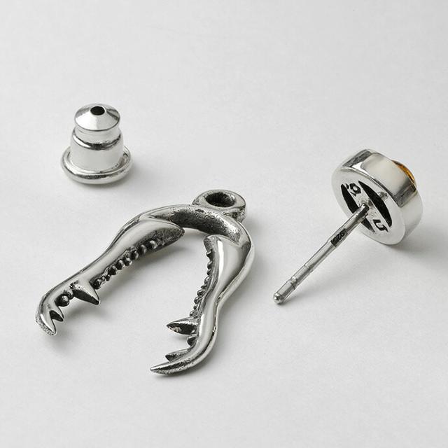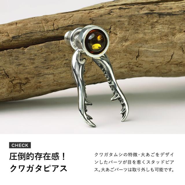 クワガタムシの特徴・大あごデザインが目を惹くスタッドピアス。大あごパーツはピアスとピアスキャッチの間に挟むように装着します。パーツを取り外して普通のピアスとしても装着可能です。太古の樹木から出た樹液が化石化した宝石・アンバー(琥珀)を中央にセット。樹液を好むクワガタにぴったりの石です。 耳に圧倒的存在感を出せる、虫好きにオススメのユニークピアスです。シルバー925は上品かつ高級感のある輝きが特徴。適切なお手入れで輝きを保つことも自分色に育てることもできる、永くご愛用頂ける貴金属です。