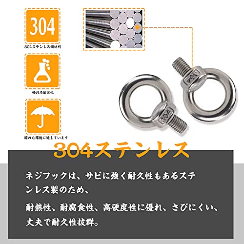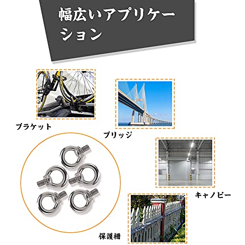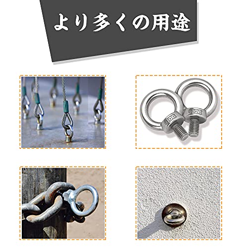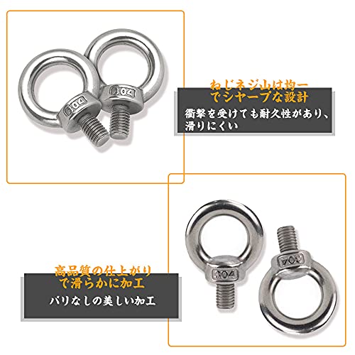 【より多くの用途】本製品は、ロープやワイヤーを使った吊り下げ時にお使い頂けるM6サイズのアイボルトになります。ステンレス製のため腐食や錆びにも強くなっており。 家具の固定や転倒防止、小物や板の吊り下げ、テントとタープの連結など様々な用途にお使い頂けますの。機械器具類の吊り下げなど、一般の荷役に利用できます。またボルトの頭部がリング状になっているので、ロープ、鎖、ワイヤーなどを通して使用できます。