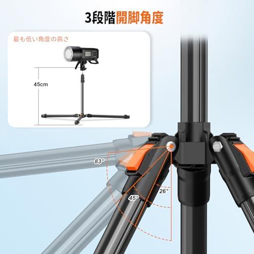 3段階開脚角度: ライトスタンド 三脚は、伸縮脚の各脚を最大 76cm まで伸ばすことができ、3段階の開脚角度調整が可能で、様々な撮影シーンに最適な角度と高さを提供します。この機能により、高低差のある地形で撮影する際に、各脚の角度と長さを個別に調整して三脚を安定させます。ストロボ スタンドの脚の角度を上下に調整する際、各段階の溝に達するたびに「カチッ」という音がします。最大開脚角度は83°で、この段階に調整すると三脚の安定性は最も高くなります。