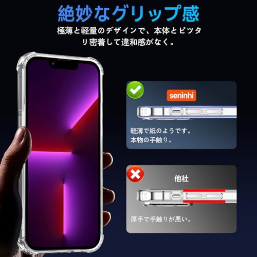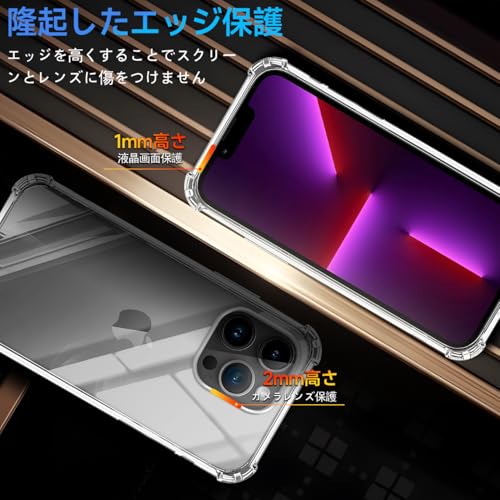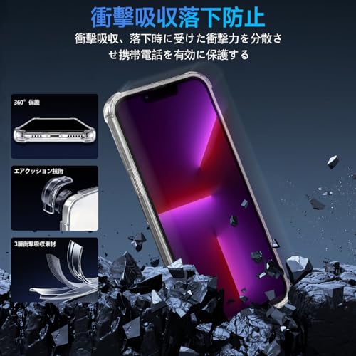 【360°フルガード 軍用グレード、高い耐衝撃性】 本製品は iPhone 13 Pro 6.1インチ おおあな に対応する透明ケースです。外側のシェルは高い耐黄い耐性を備えた最先端技術ADMを採用しております。しかも環境にやさしく、無毒で無味の高品質の素材を使用して、酸化防止処理しており、長年でも黄色くなりません。多数回のテストした後、2mの高さで様々な角度から26回落としましたが、携帯電話が全然傷がありませんでした!更に四隅の耐衝撃性は通常の携帯電話ケースの5倍に達し、携帯電話を全面的に保護できます。(ご注意:ご購入前機種をよくご確認くださいね。間違った機種の購入による使えないことを避けてください)