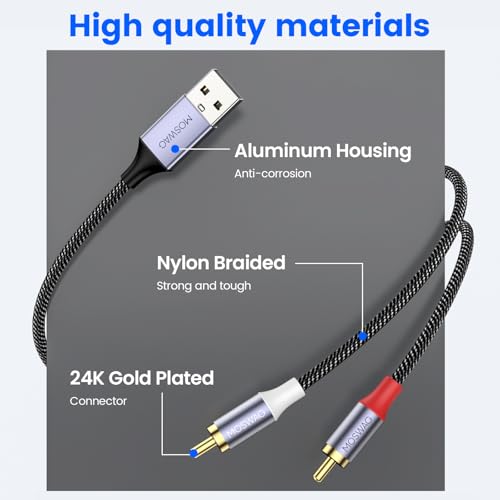 【USB - Dual RCAオーディオAUXケーブル】このUSB - 2RCAオーディオケーブルは、頑丈なナイロンブレードジャケット、金メッキコネクタ、腐食に強いアルミニウム合金ハウジングを備えた高品質の素材で作られており、柔軟性のあるナイロンブレードジャケットにより、狭いコーナーなどスペースが限られている場所でもケーブルを簡単に設置し、使用することができます。