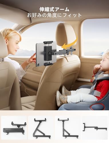 車載タブレットホルダー 後部座席 伸縮アームスタンド スマホホルダー 360度回転 簡単取付 安定性が向上 折り畳み式 ヘッドレスト ホルダー バーの適用幅範囲8cm-15cm 4.7-13インチ 26mm 厚手対応 アイパッド / スマホ / スイッチ / モニターに対応