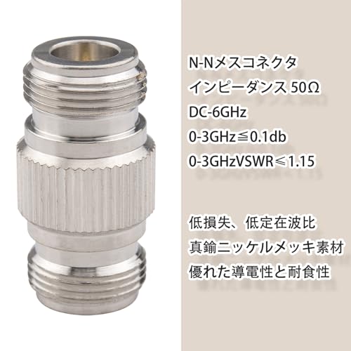 タイプと仕様: N-N タイプ RF 同軸コネクタ (TV には適していません)、N メス - N メスコネクタ、インピーダンス 50Ω、材質真鍮ニッケルメッキ、最大動作周波数 0-6GHZ、3GHz 低損失