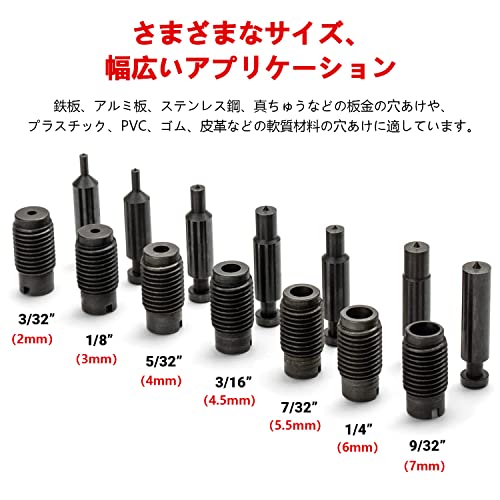 【幅広い用途】メタルパンチキットは、建物の装飾者や天井の建設作業者による使用に適しています。鉄板、アルミ板、ステンレス、真ちゅうなどの薄い金属の穴あけや、プラスチック、PVC、ゴム、皮革などの柔らかい素材の穴あけに適しています。
