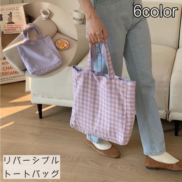 トートバッグ リバーシブル ショルダートート 肩掛け 手提げかばん レディース 女性 カバン 鞄 キャンパス 肩掛けカバン チェック柄 無地 シンプル