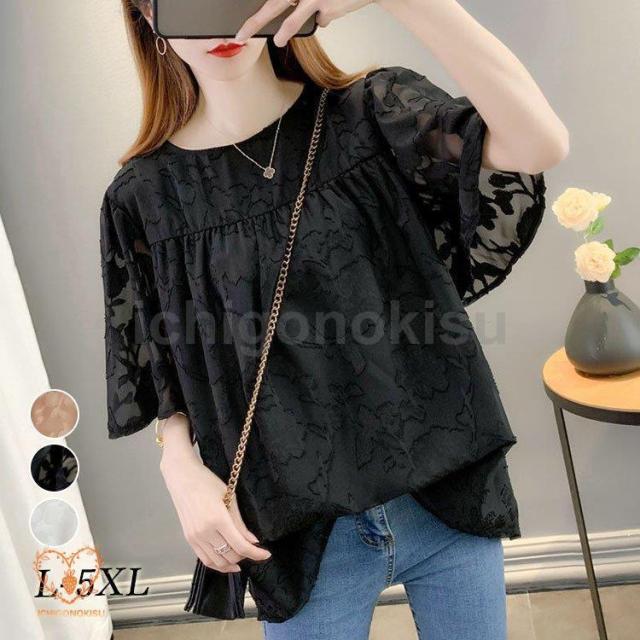 ブラウス レディース 40代 夏 新作 オシャレブラウス シャツ 半袖トップス クルーネック フレア袖 上品 大人 通勤OL ゆったりシャツ30代 50代