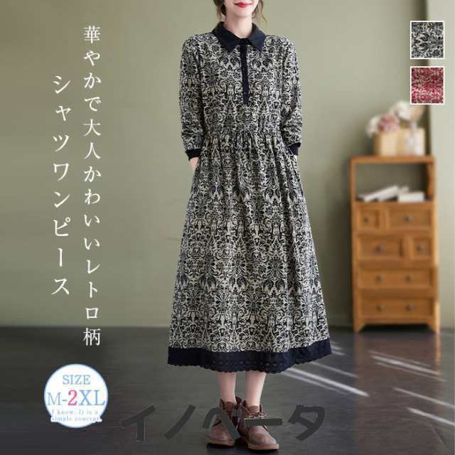 シャツワンピース 花柄ワンピース ロングワンピース レディース 長袖 ロングシャツワンピース 総柄 ミモレ丈 森ガール レトロ 大きいサイズ ロングワンピ ゆったり 体型カバー Aライン カジュアル 大人可愛い 春 秋 冬 きれいめ 送料無料