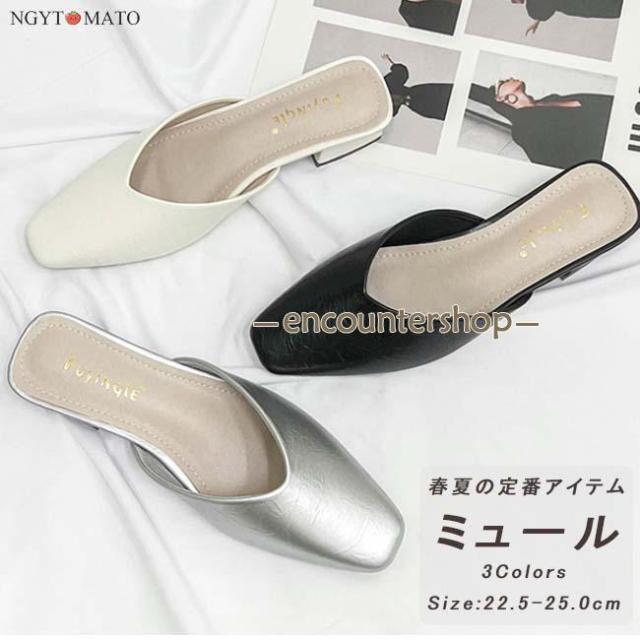 ミュールパンプス レディース ミュールサンダル スクエアトゥ ミュール ローヒール Vカット パンプス かかとなし シルバー 履きやすい 歩きやすい おしゃれ 大人