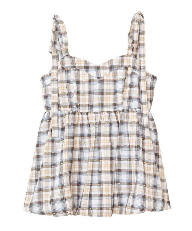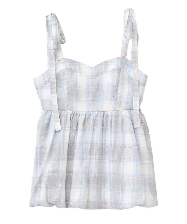爽やかなカラー配色のチェック柄が印象的なデザインキャミビスチェ。ネップ糸を組み合わせたポップな雰囲気も魅力的です。リボンストラップにカーブのかかったトップラインも特徴的。トレンドのバルーンヘムでふんわりとしたシルエットが今年らしい、スタイリングの主役になるおすすめのアイテムです。透け感[なし]
