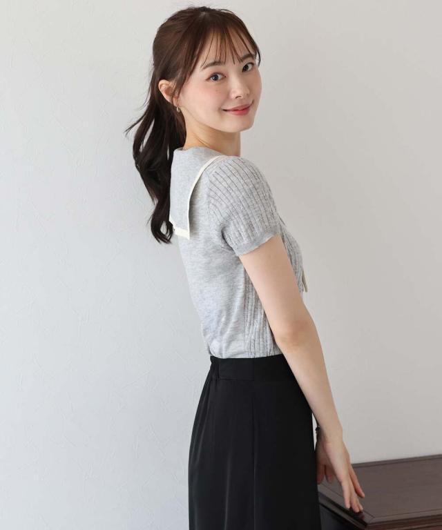 バイカラー衿できちんと感がありながらもフェミニンさを演出するニットトップス。