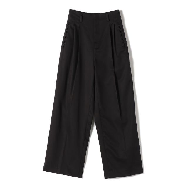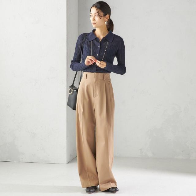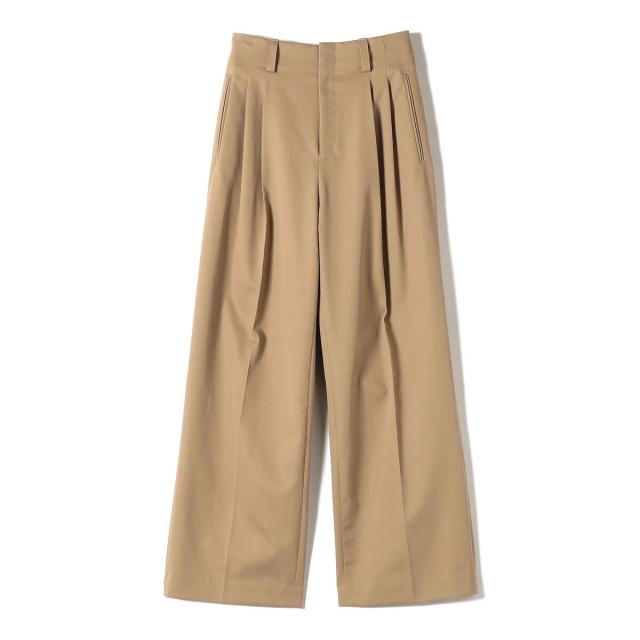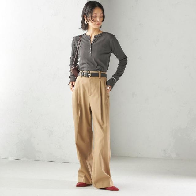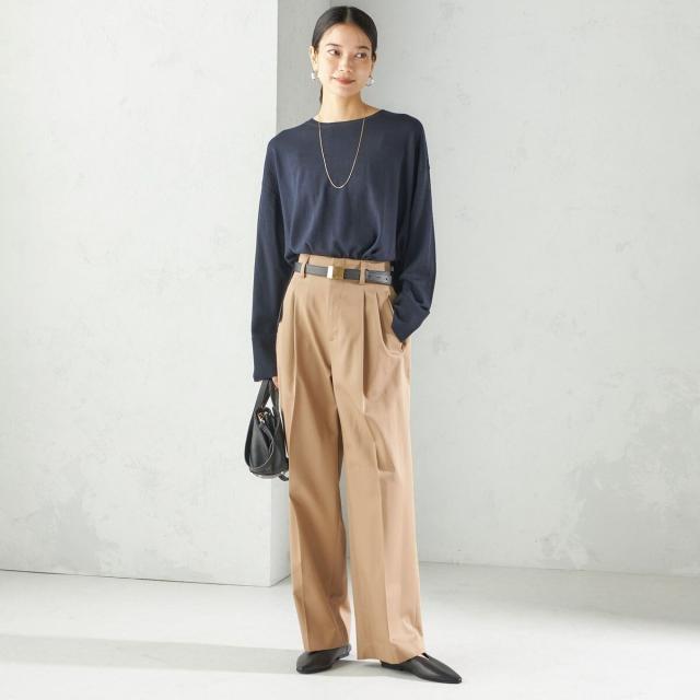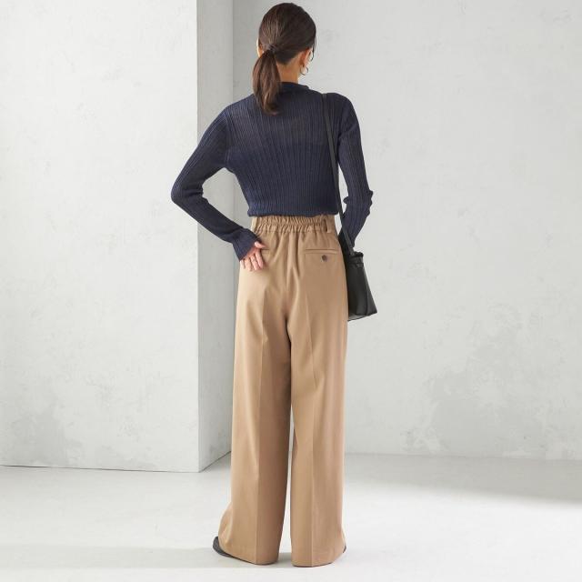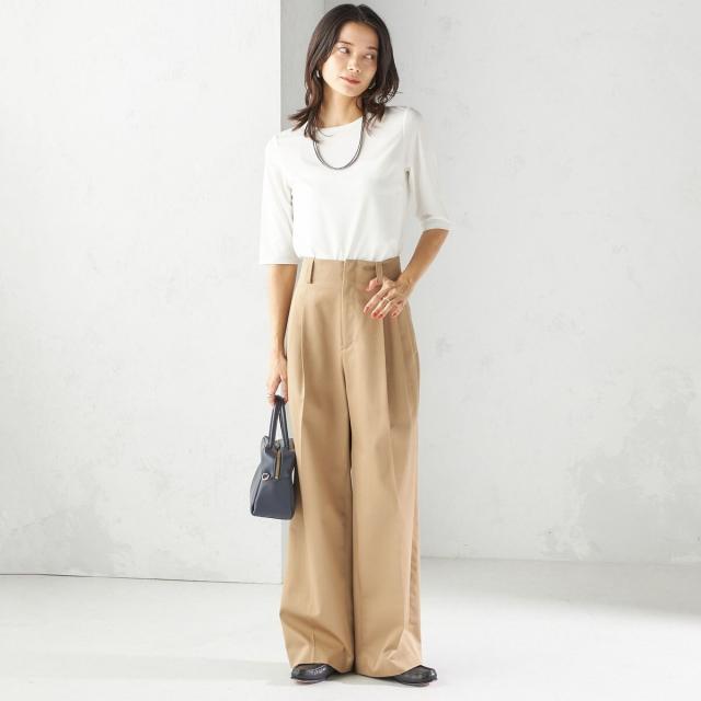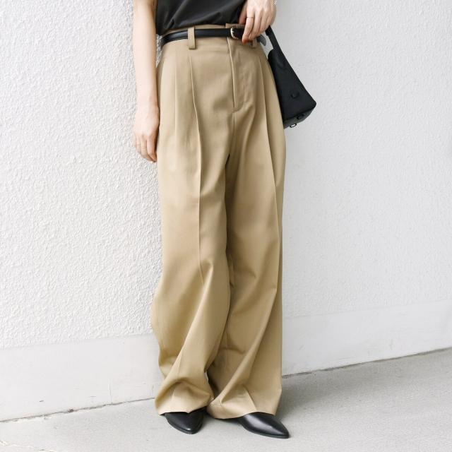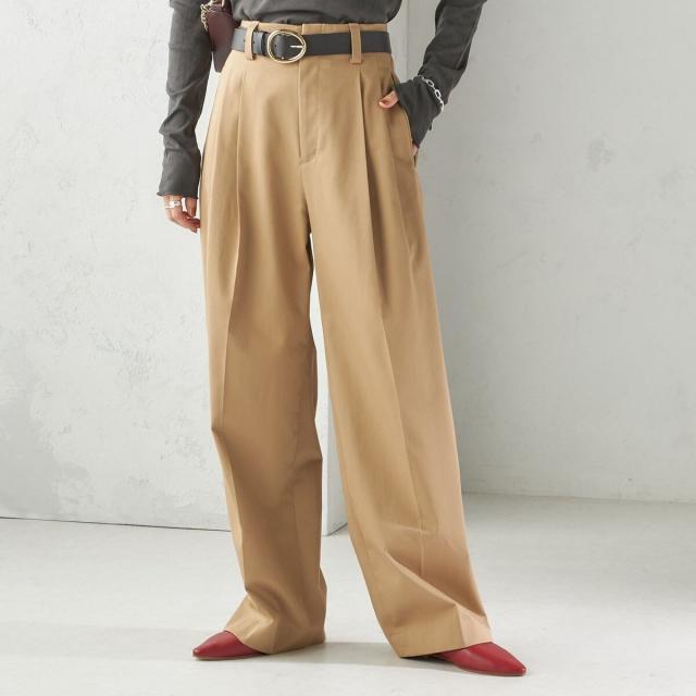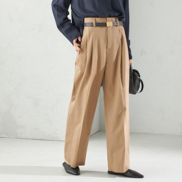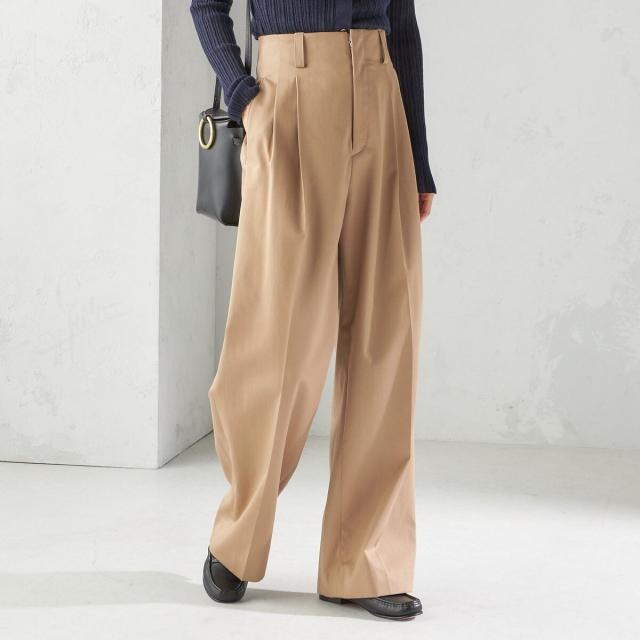 お腹まわりを自然にカバーしつつ腰位置を高く見せるハイウエスト設計に、2タックを施したスタイルアップ効果のあるワイドパンツ。