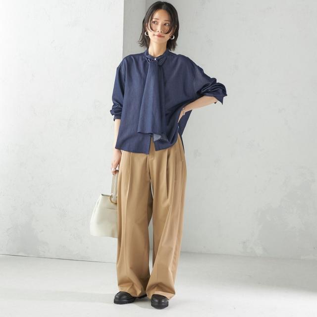 シンプルながらもシルエットと素材感にこだわった一枚は、きれいめなブラウスやシャツとも好相性で、幅広いコーディネートに対応する万能ボトムです。