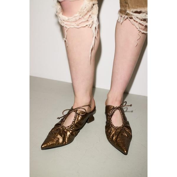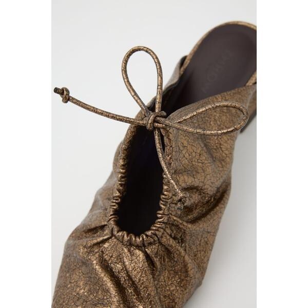 THROW by SLY【GATHER HOLE MULE】■POINT:アッパーに大胆に取り入れたギャザーホールデザインが目を引くポインテッドミュール。■DETAIL:少し光沢のある表面感の素材を使用しているので履くだけで上品な印象に。■STYLING:カジュアルなデニムスタイルはもちろん、オケージョンなど様々なシーンで活躍できるアイテムです。■FABRIC/MATERIAL:少し光沢のある表面感の合成皮革を使用。BLKとGLDは同素材を使用していないため、表面感が異なります。[注意事項]※画像の商品はサンプルです。実際の商品と仕様、加工が若干異なる場合があります。※画像の商品は光の照射や角度、お使いのモニター環境により、実物と色味が異なる場合がございます。※着用、お取り扱いの際は、アテンションタグをご確認ください。※一部予約商品につきましては生産上の都合によりお届け予定日や店頭発売と前後する場合もございます。※追加生産商品は、一部の店舗、通販で販売中の場合がございます。予めご了承下さい。