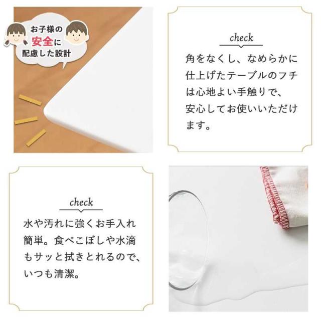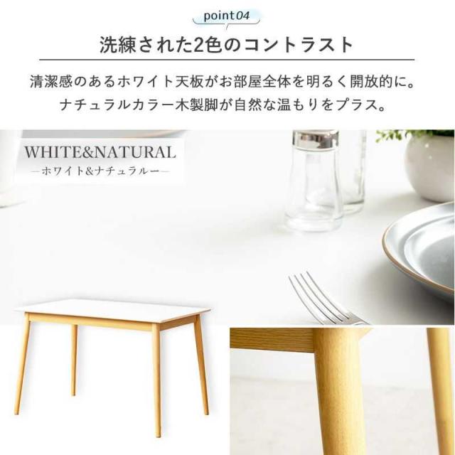 清潔感のある白い天板と、温もりを感じるナチュラルカラーの天然木脚が魅力的な、ツートンカラーダイニングテーブルです。