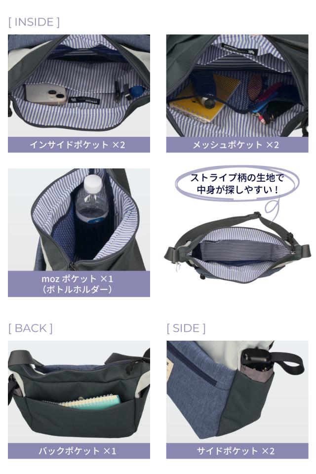 | 【外側】 ・落としポケット×1 ・フロントポケット×1 ・ライトポケット×1 ・レフトポケット×1 ・バックポケット×1 【内側】 ・mozポケット×1(ボトルホルダー) ・インサイドポケット×2 ・メッシュポケット×2 |