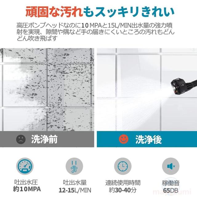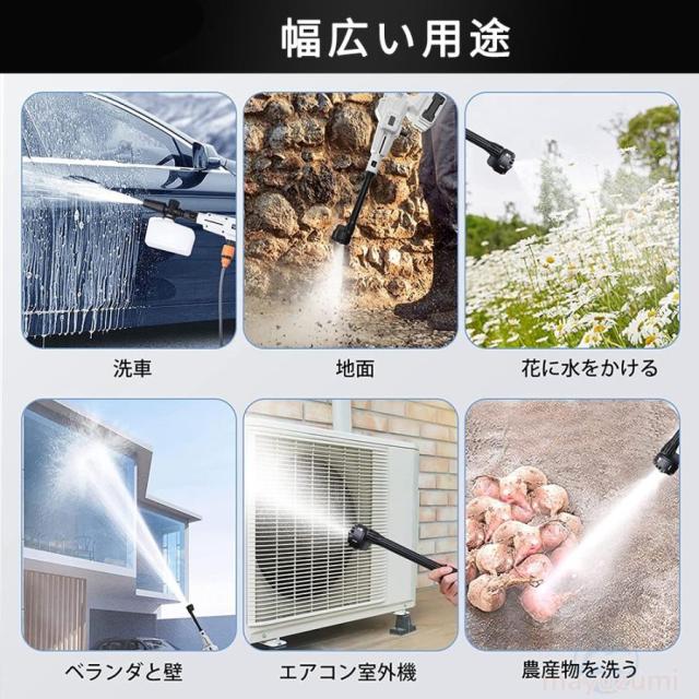 ポータブル洗車機のため、高圧水洗機は庭の散水や植木の水やり、打ち水などに便利です。マンションなどのベランダと窓はもちろん、車、バイク、自動車、自転車などの洗車機器、年末など定期掃除、BBQなどキャンプ用品の掃除、 庭の植木散水、お風呂や室内汚れの掃除、農産物の泥洗浄、塩害や台風後など大面積の地面掃除など場合におすすめます。