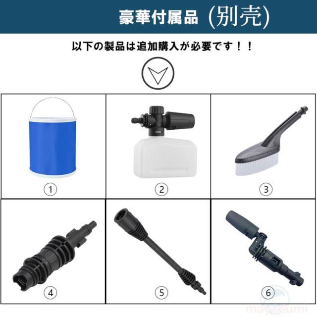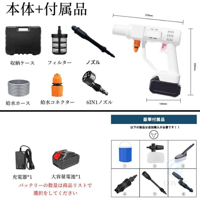 ★お届け内容:洗車高圧ガン本体x1、収納ケースx1、角度切替可の6in1多機能マルチノズルx1、バブルボトル用ノズル*1、大容量バッテリー(別購入)、フィルタx1、給水ホースx1、ホースリテーナx1、充電アダプターx1(別購入)。