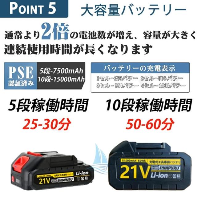 ■ 1.5/3.0Ah大容量バッテリー:満充電後、約25-30分連続使用可能です。