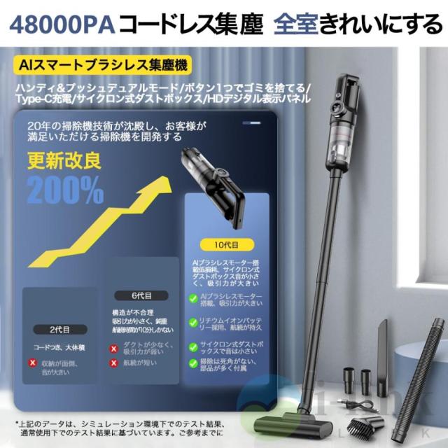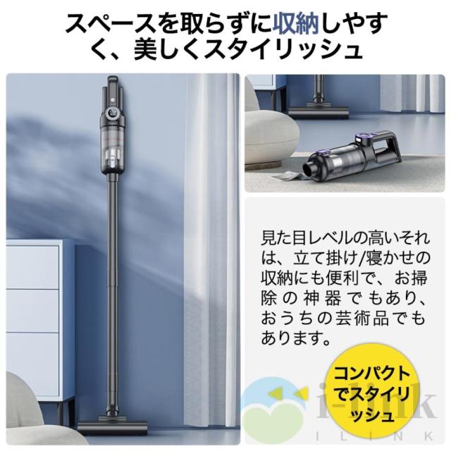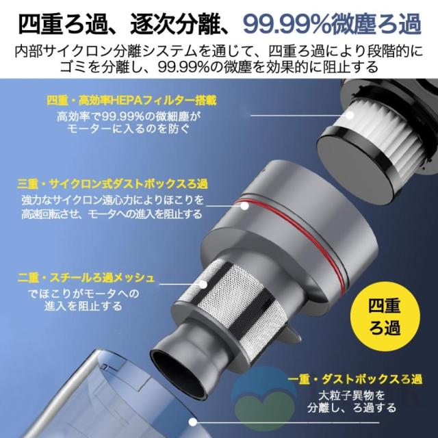 掃除機 コードレスは最先端のブラシレスモーターを採用し、吸引力が48000Pa以上に達し、従来の掃除機より65%アップ!サイクロン掃除機で吸引持続率を99%!床面の微細なホコリからペットの毛、隙間に潜むホコリも、この掃除機で逃しません、一往復で残りなし!超強力な吸引力と低騒音を両立させており、掃除機動作中の音が大幅軽減。コードレス掃除機なので、電源コードに縛られないのは最大のメリットです。