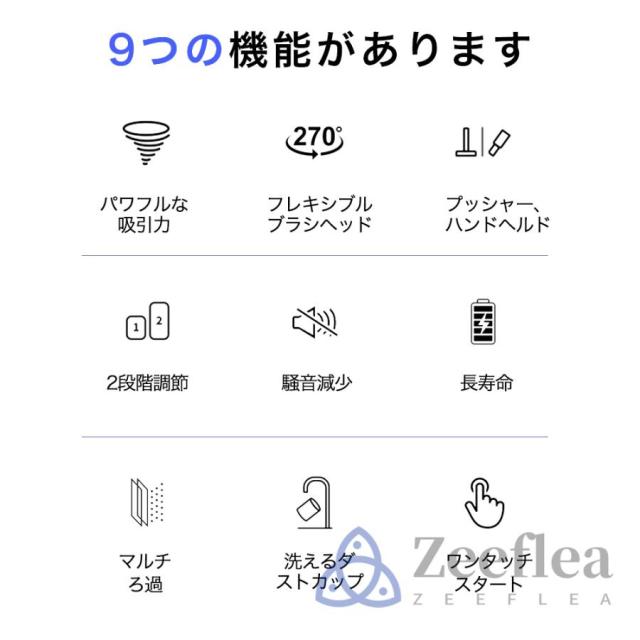 zeefleaコードレス 掃除 機は450Wブラシレスモーター搭載し、吸引力が50000Pa以上に達します。普通の掃除機と比べ、50%よりパワフルに。ハイパワーブラシレスモーターを採用されて、安定したパワー供給により、長い時間変わらない吸引力が続き、しっかり掃除できます。サイクロン式で、0.3ミクロンもの微細な粒子を99.99%捕らえる排気性能の優れた多重濾過システムを通して、きれいな空気を排出します。片手でも使える軽さ、電源コードに縛られなくて、スイッチボタンを押すだけで(連続稼働モード設定)、とても便利です。