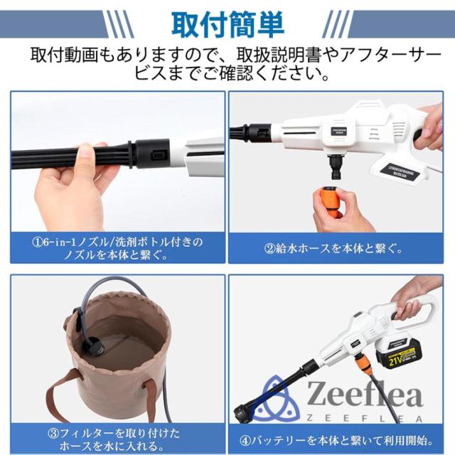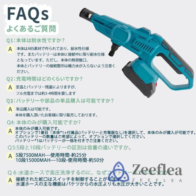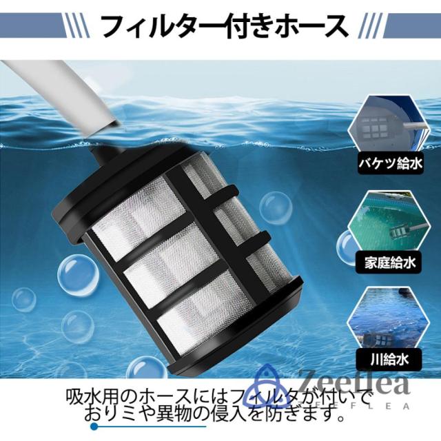 大容量バッテリーで、低圧時は約25?30分連続使用できて頻繁的に充電する手間がなくて、安心に使えます。【5m給水ホース】長いホースを搭載し、湖、川、やためておいた雨水などの水を使用する時にとても便利です。ホースが短くて池の水で洗車時に噴射水を車に届かないなど給水悩みと不便がなく更に使い便利です。