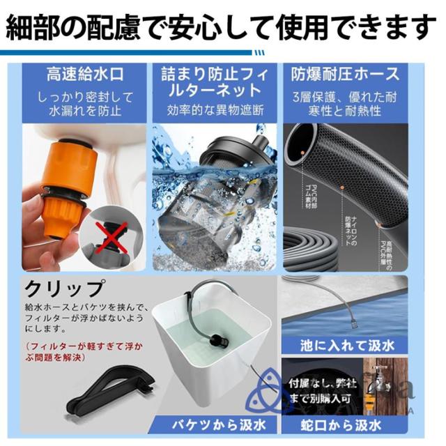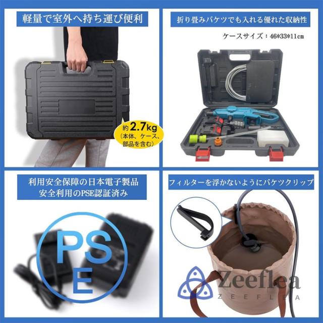 専用な水源の必要がなくて、池、バケツでも利用できて、面倒な水道栓の接続作業もなく洗浄の準備が簡単です。(*バケツが付属無し、別途で購入してください)