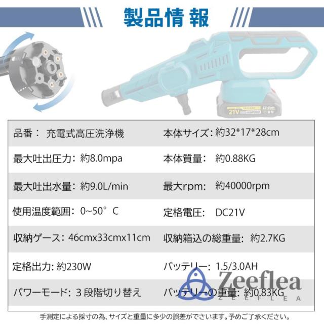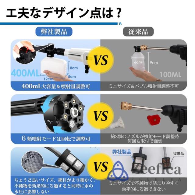 新しくアップグレードされたブラシレス高性能純銅モーターを搭載しており、強力な安定性と耐久性と強力なパワーの効率を向上されます。それに過電流保護、過電圧保護、過熱保護、充放電保護、アップグレードされた高効率プランジャーブースターポンプを取り付けています、駆動力は450ワットで、強力な圧力と安定して稼働できて、市販品より随分長持ち、頑固な汚れでも綺麗に洗えます。
