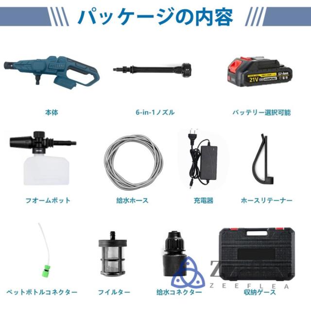 ★お届け内容:洗車高圧ガン本体x1、収納ケースx1、角度切替可の6in1多機能マルチノズルx1、バブルボトル用ノズル*1、フィルタx1、給水ホースx1、ホースリテーナx1、日本語取扱説明書x1。