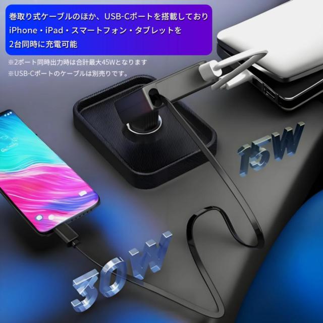 ●巻取り式ケーブルのほか、USB-Cポートを搭載しており、iPhone・iPad・スマートフォン・タブレットを2台同時に充電可能です