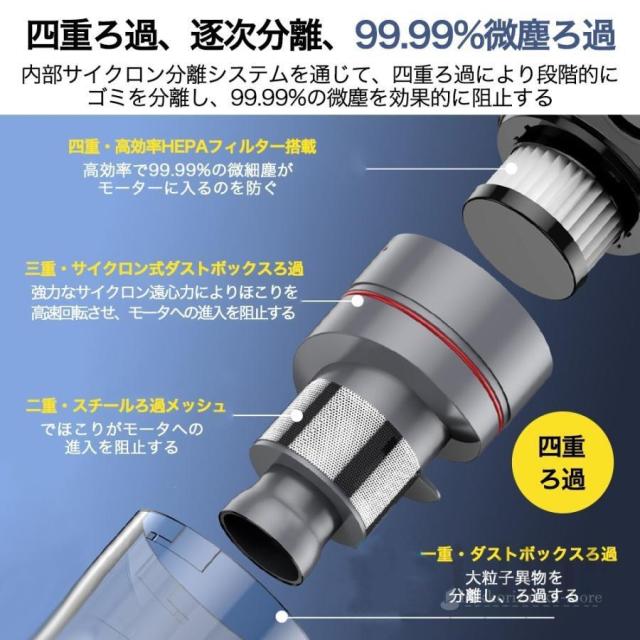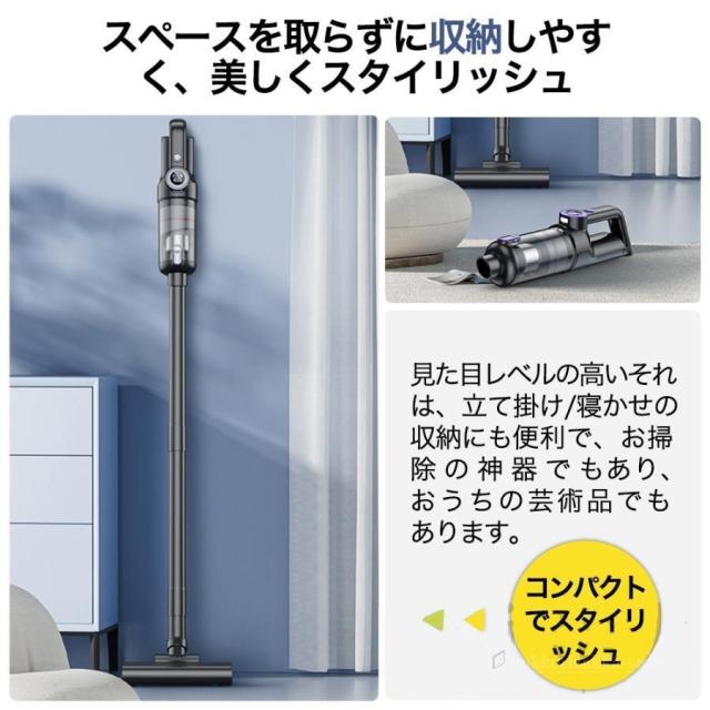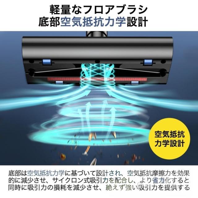 | 48000p強力吸引・ブラシレスモーター | 掃除機コードレスは最先端のブラシレスモーターを採用し、吸引力が48000Pa以上に達し、従来の掃除機より65%アップ! サイクロン掃除機で吸引持続率99%! 微細なホコリやペットの毛も逃さず、超強力な吸引力と低騒音を両立。 コードレスのため、電源コードに縛られないのが最大のメリット。 |