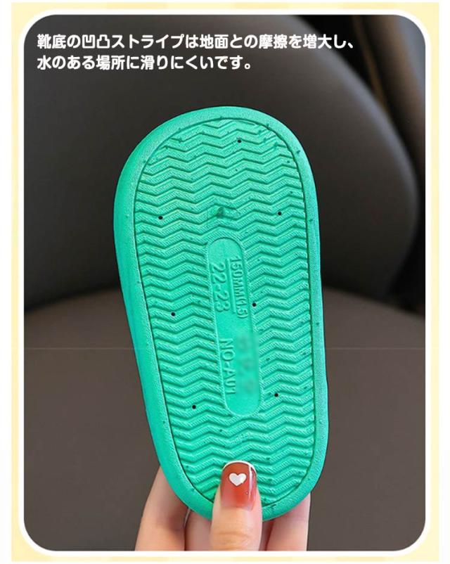 | クッション性が高く、ふわふわした肌ざわりで、着地時の衝撃を吸収し、履き心地よいです 環境にやさしい無味・無臭PVC素材で作られて、軽量で柔らかく弾力性が高く、寒い場所などでも柔軟性を保ちます。 撥水性と耐久性に優れ、風雨や紫外線を浴び続けても劣化しにくいです。汚れが付きにくく、付いても軽く拭いたり洗ったりするだけで汚れが簡単に落ちます。 靴底の凹凸ストライプは地面との摩擦を増大し、水のある場所に滑りにくいです。 子供の足型によって設計されて、フィット感が高いです。 すべての季節と場所に適しています。室内に使用に限らず、屋外にもサンダルとしての使用もOKです。バスルーム、ビーチ、シャワー、プール、温泉、海、キャンプなどに利用できます | |