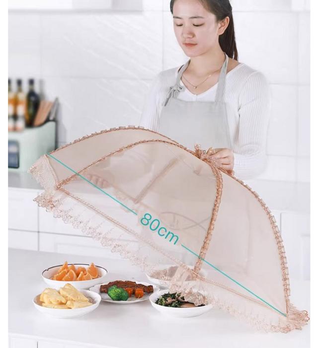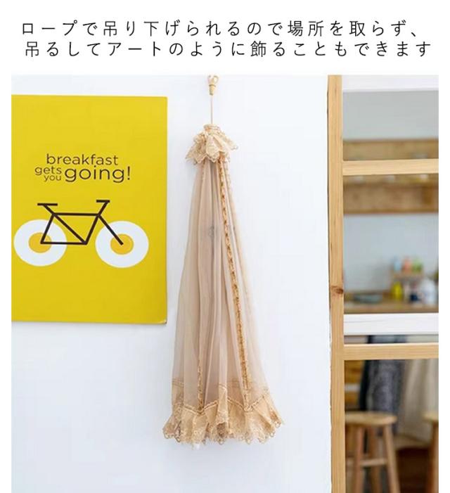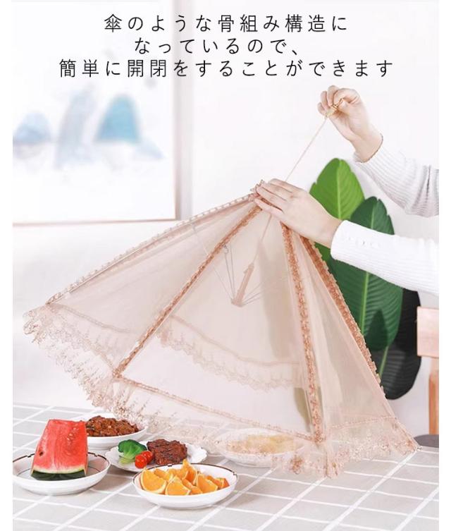 | 卓上の料理を虫や埃から守るための食卓カバーです。 メッシュ生地で出来て、通気性が良く、夏でも食べ物が腐りづらいです。 傘のような骨組み構造になっているので、簡単に開閉をすることができます。 フードカバーを被せることで、ハエ・蚊・小さな虫の侵入をシャットアウト。 ロープで吊り下げられるので場所を取らず、吊るしてアートのように飾ることもできます。 汚れた際には水洗いが可能で、清潔な状態を簡単に保つことができます | |