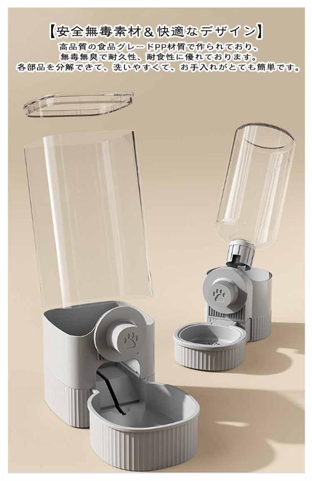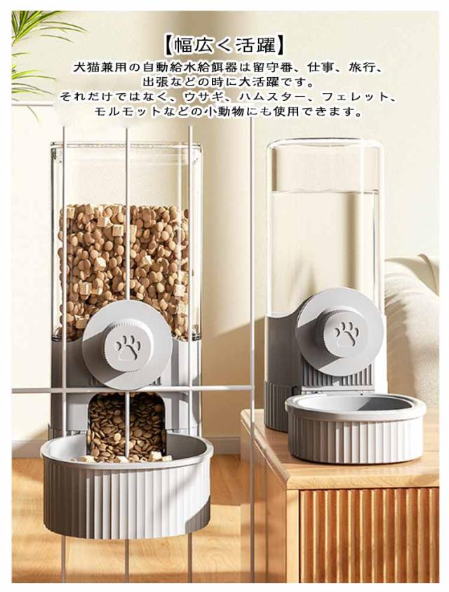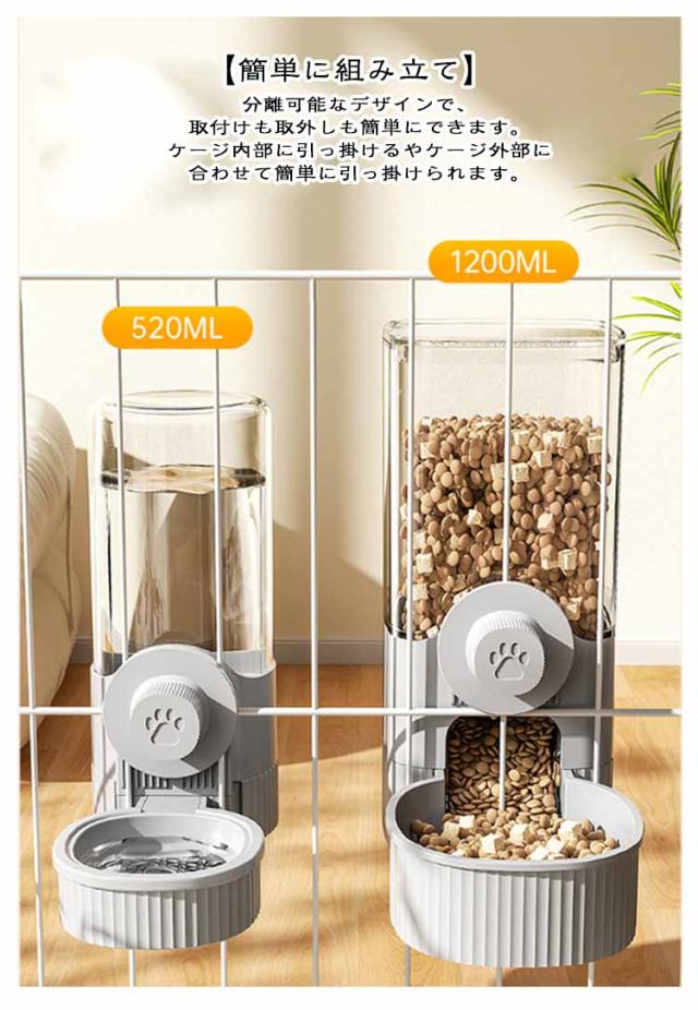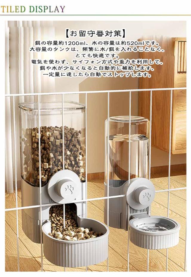 | 【お留守番対策】 餌の容量約1200ml、水の容量は約520mlです。 大容量のタンクは、頻繁に水/餌を入れることなく、とても快適です。 電気を使わず、サイフォン方式や重力を利用して、餌や水が少なくなると自動的に補給します、一定量に達したら自動でストップします。 仕事、デート、短期旅行などの時、ペットのお留守番も心配ないです。 【安全無毒素材&快適なデザイン】 高品質の食品グレードPP材質で作られており、無毒無臭で耐久性、耐食性に優れております。 各部品を分解できて、洗いやすくて、お手入れがとても簡単です。 透明で中身が見やすく、餌の状況がよくわかりエサの容量も簡単に把握することができるます。 【簡単に組み立て】 分離可能なデザインで、取付けも取外しも簡単にできます。 ケージ内部に引っ掛けるやケージ外部に合わせて簡単に引っ掛けられます。 高さが調節可能で、ケージによって、ペットにぴったりの高さに調節でき、食事も便利になります。 【幅広く活躍】 犬猫兼用の自動給水給餌器は留守番、仕事、旅行、出張などの時に大活躍です。 それだけではなく、ウサギ、ハムスター、フェレット、モルモットなどの小動物にも使用できます。 | |