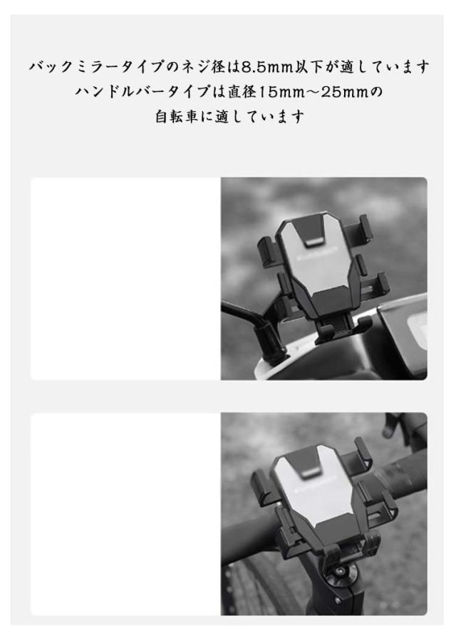 | 4.7〜7.2インチの携帯電話に適しています 片手操作: ロックが解除されたら軽く押し下げ、手を離すと自動的に固定され、素早くアクセスできます。 2つの伸縮モジュールを内側に押すと自動的に解放され、携帯電話を装着して中央のボタンを押すと自動的に携帯電話がロックされます。 携帯電話用の厚手のスポンジパッドは衝撃を軽減し、滑りを防ぎ、携帯電話を傷つけにくいです。 バックミラータイプのネジ径は8.5mm以下が適しています ハンドルバータイプは直径15mm〜25mmの自転車に適しています | |