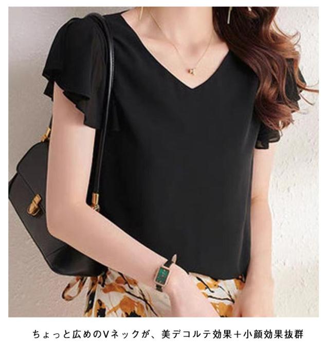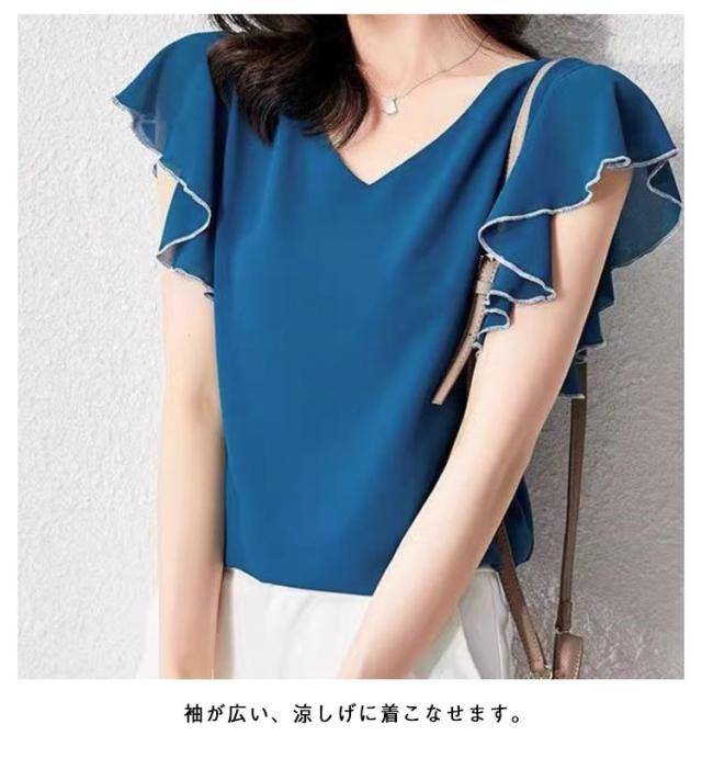夏 ブラウス チュニック フリル袖 シャツ トップス 無地レース Vネック シンプル シフォン レディース 春 フリル袖カットソー 結婚式 パーティー 二次会 シフォン フォーマル 薄手