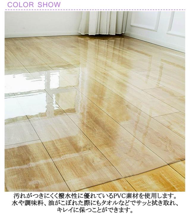 | 厚さ1mm、12サイズ選べる!子どものいるご家庭には安心な素材 衝撃やキズ・汚れから床を守る 汚れがつきにくく撥水性に優れているPVC素材を使用します。 水や調味料、油がこぼれた際にもタオルなどでサッと拭き取れ、キレイに保つことができます。 難燃性素材で燃えにくく万が一着火した場合も、燃え広がることがなく安心。 耐熱加工を施しているため、床暖房にも対応しております。 透明なので、景観を阻害せずにインテリアにもしっかり馴染みます。 用途や場所を選ばず、様々なシーンで活躍します。 | |